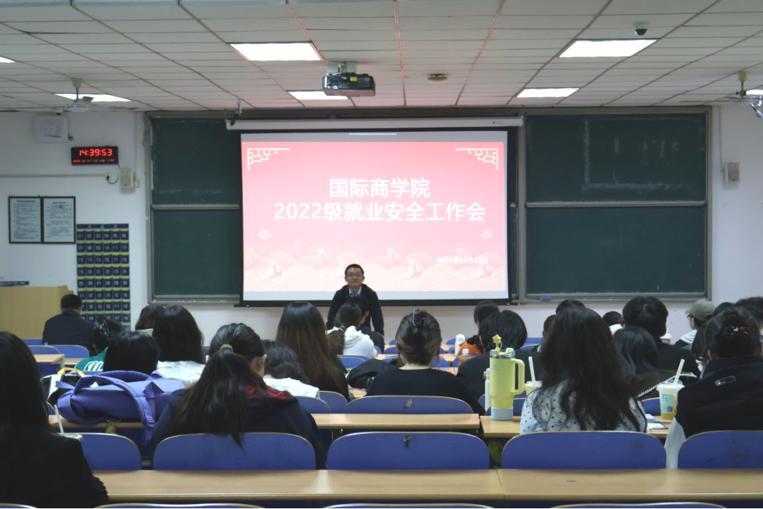 为切实保障2022级学生就业与升学安全,明确毕业季重点任务,10月17日下午,国际商学院在逸夫楼二教2110教室召开“2022级就业安全工作会”。本次会议由国际商学院党委副书记孙晓明主讲,2022级全体学生参加。