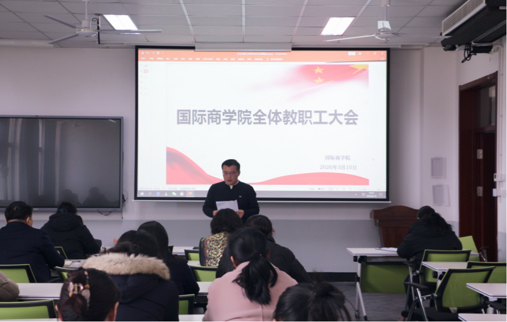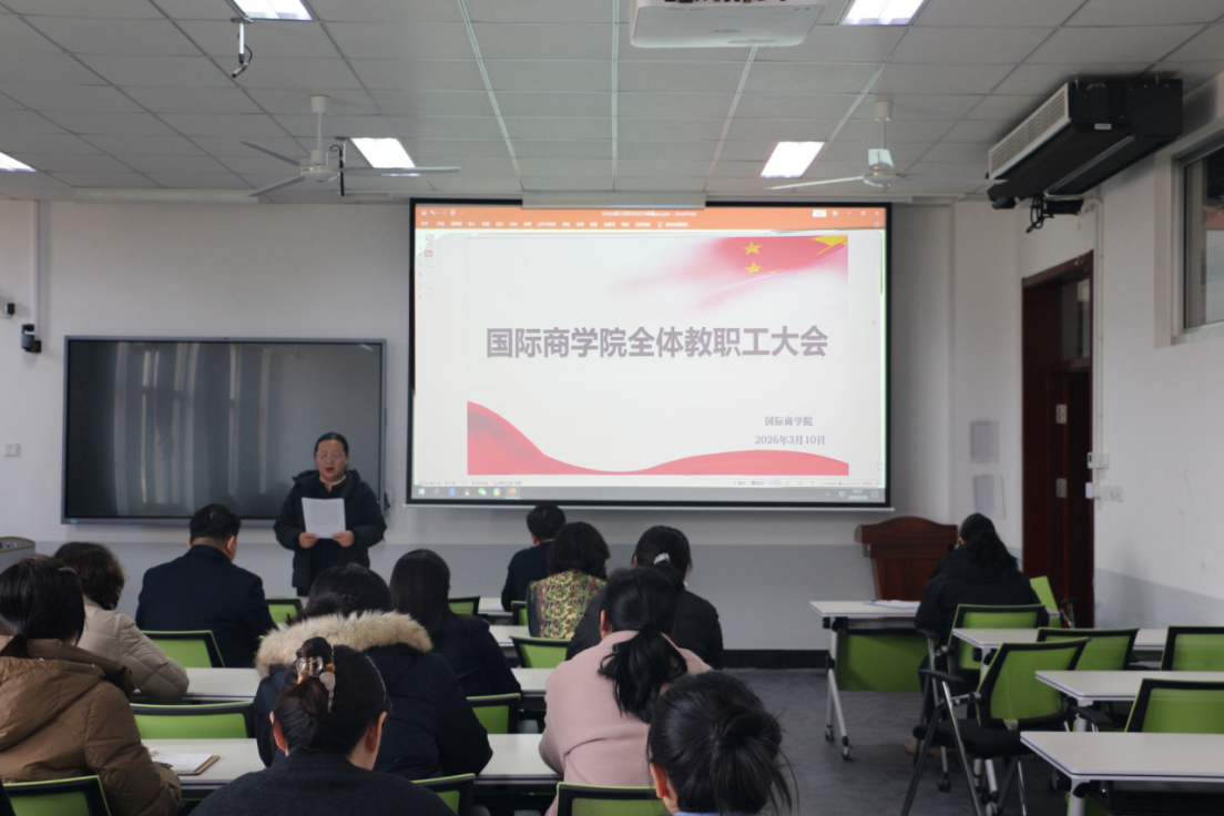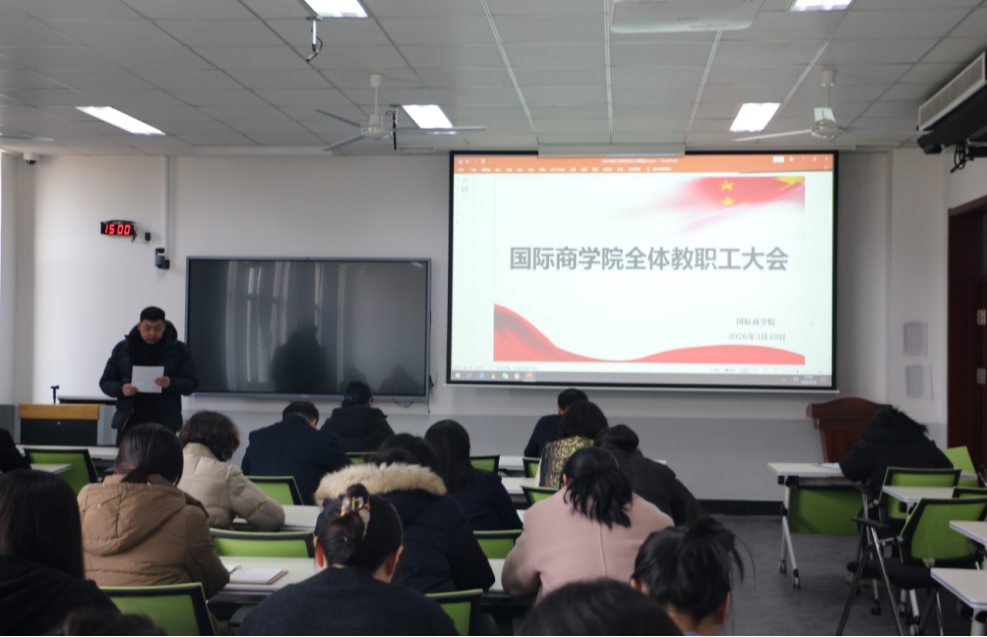 为深入贯彻落实学校九届三次双代会工作部署,锚定学校年度发展目标,明确学院工作方向,3月10日下午,国际商学院在逸夫楼3222教室召开全体教职工大会暨2026年工会会员大会,学院领导班子、全体教职工参加会议。院党委书记、工会主席肖烨主持会议。