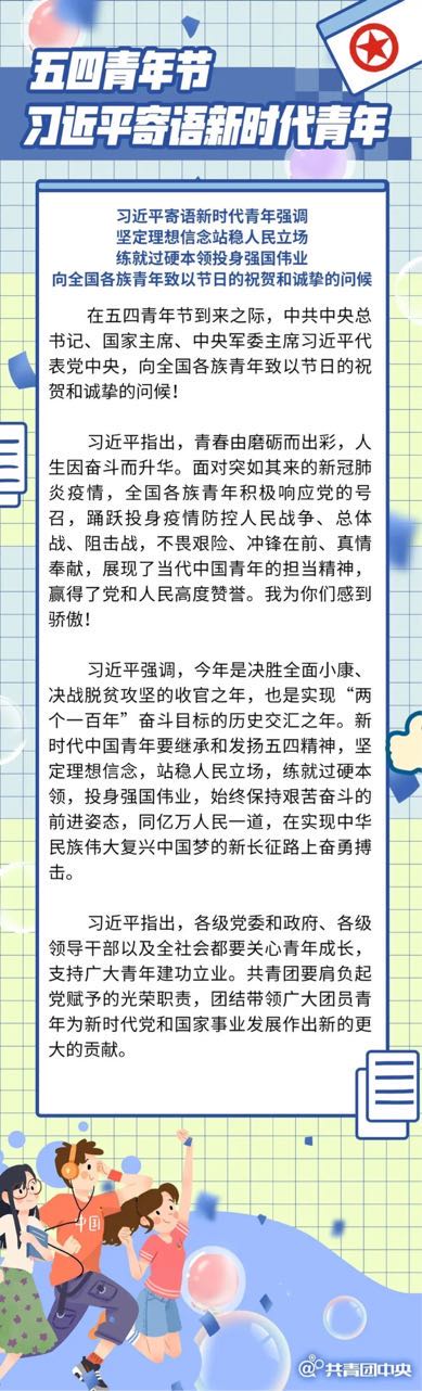在五四青年节到来之际,中共中央总书记、国家主席、中央军委主席习近平代表党中央,向全国各族青年致以节日的祝贺和诚挚的问候!