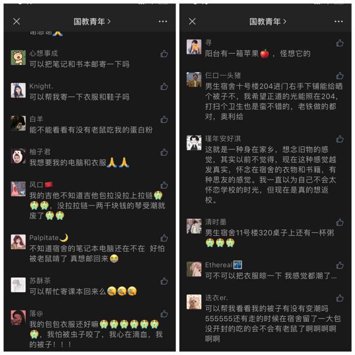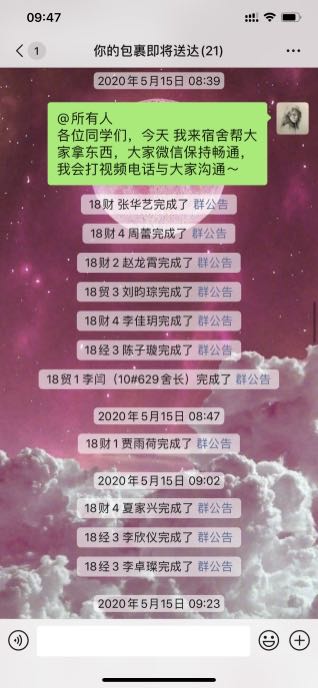 五月初,我们通过公众号向全院学生征集帮助意向,留言区收集到了许多同学们的“网上订单”。除此之外,辅导员们还通过以班级为单位向同学们发送的反馈信息表,整理学生信息,做好标签,建立微信群,以便更好地为同学们邮寄物品。