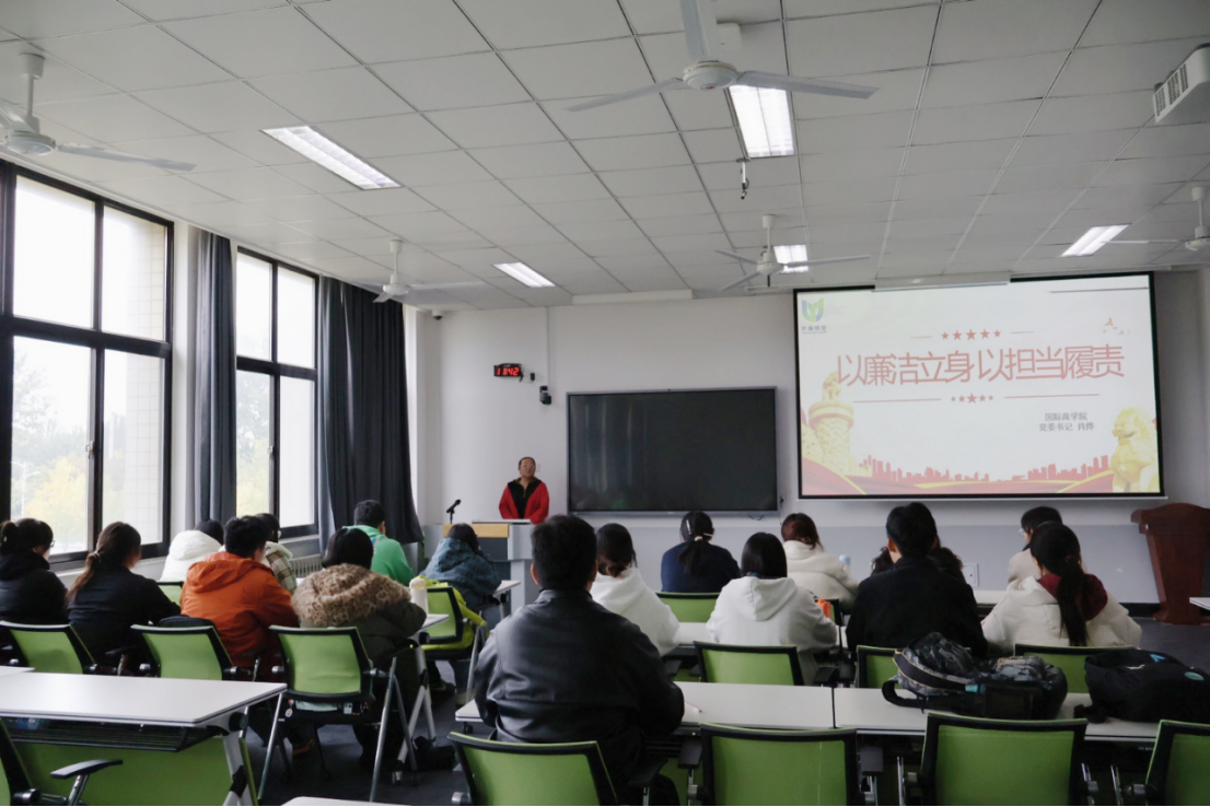 10月30日,国际商学院于逸夫楼3222教室开展“以廉洁立身 以担当履责”主题党课,学院党委书记肖烨主讲,2025年第二批发展对象参加。本次党课紧扣反腐常态化背景,以强化思想为根基,明确青年党员成长方向,筑牢廉洁底线、勇担时代责任。